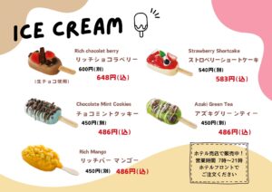 いつもホテル秘境の湯をご利用いただき、誠にありがとうございます。 この度ホテル売店にてアイスクリームの販売を開始いたしました。 日帰り入浴の方でもお買
