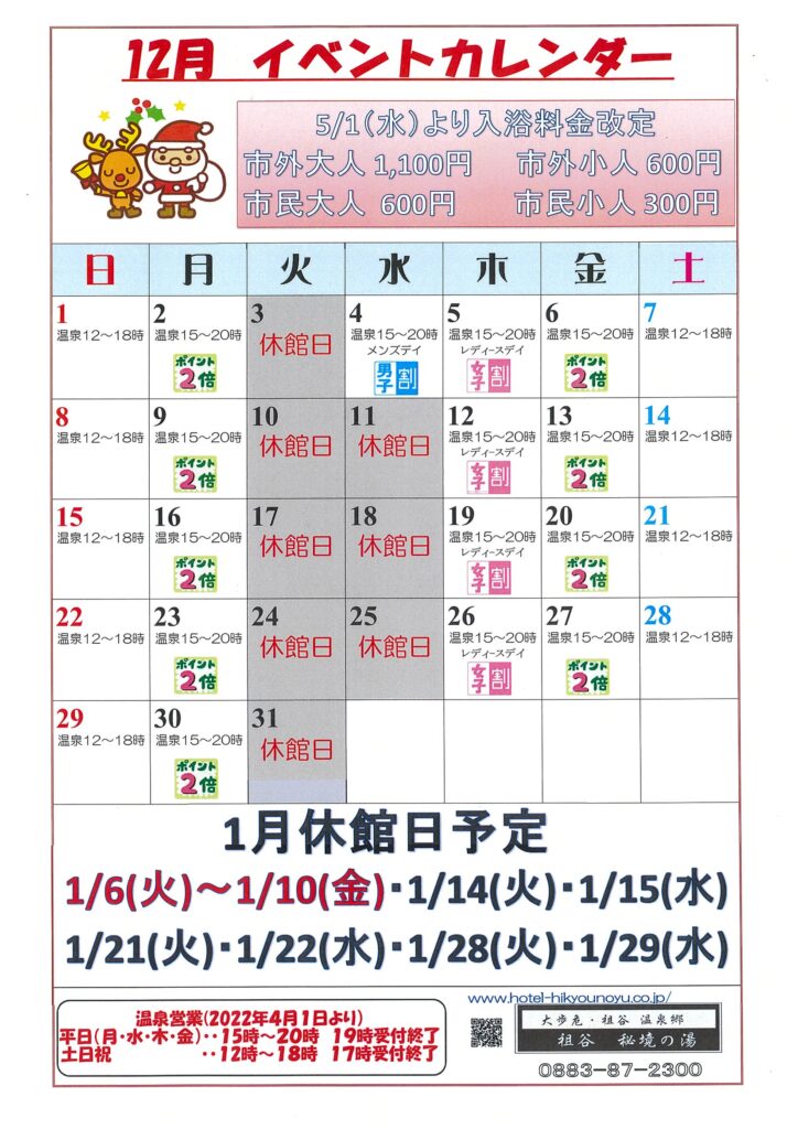 12月の日帰り入浴営業時間は、上記カレンダーの通りでございます。