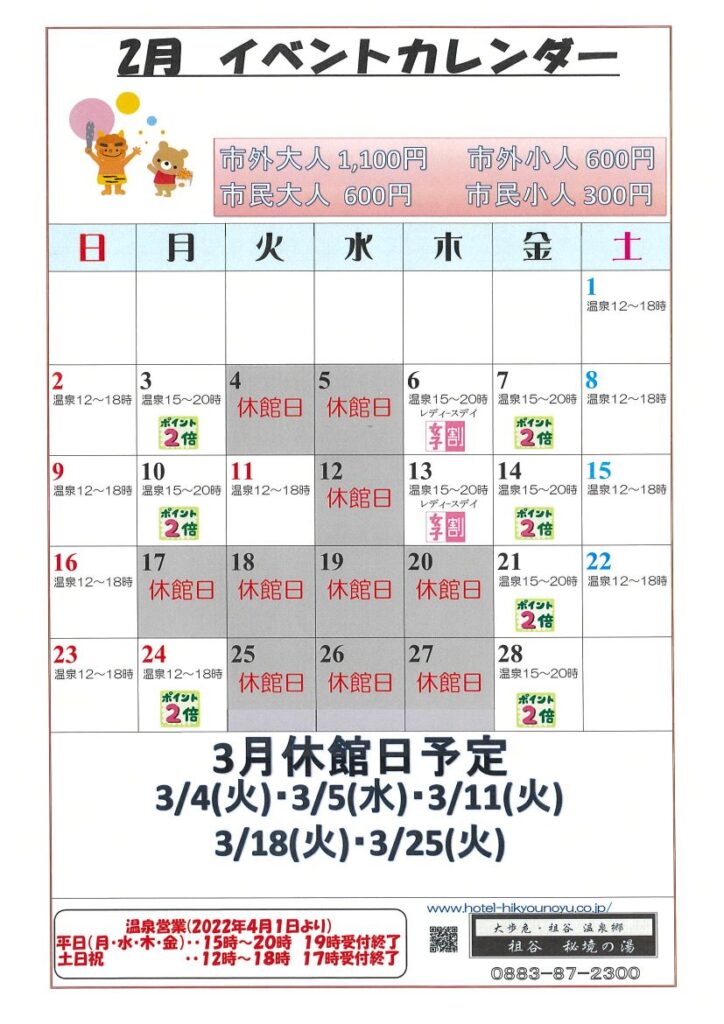 2月の日帰り入浴営業時間は、上記カレンダーの通りでございます。