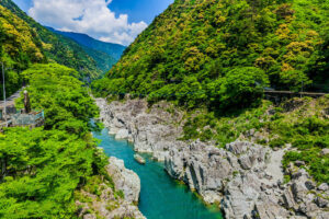 深い山に囲まれた祖谷街道から、祖谷川の流れや山々を一望できる場所に「ひの字渓谷」があります。蛇行する祖谷川の姿がひらがなの「ひ」の字に似ているところか